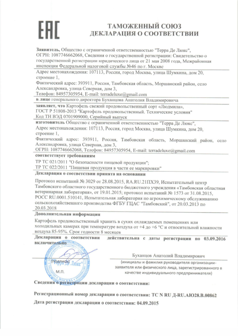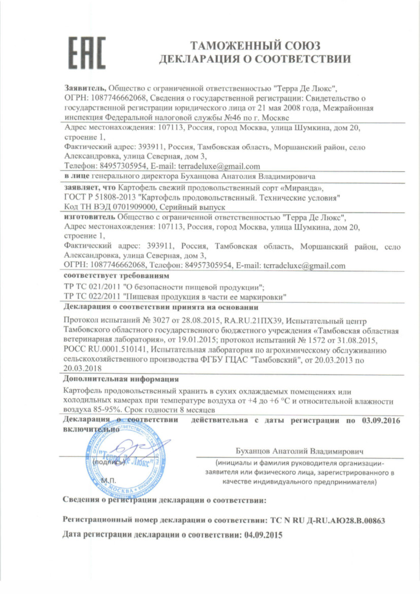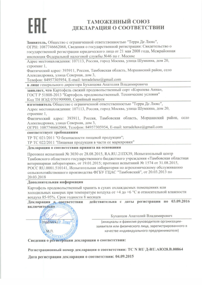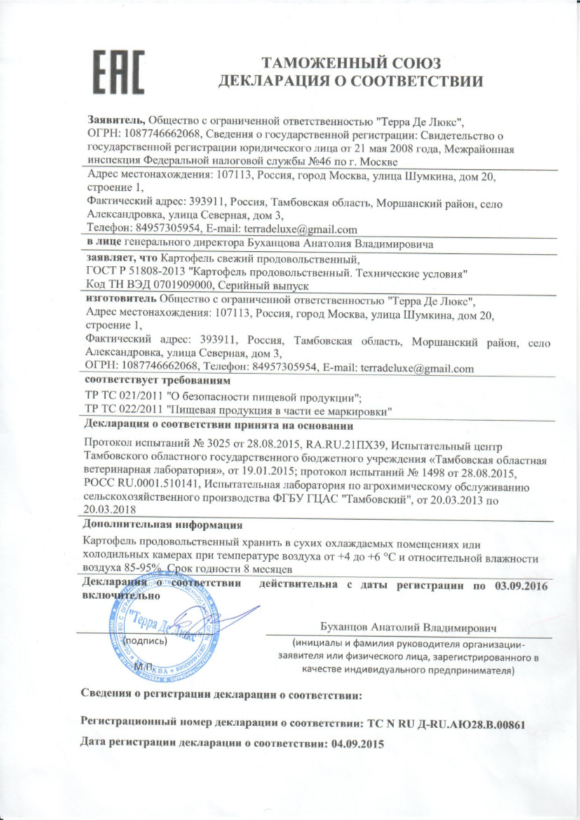 Поднимем престиж российской сельскохозяйственной продукции вместе! Предлагаем картофель различных сортов, выращенный на собственных полях компании «Терра де люкс», расположенных в экологически чистом районе Тамбовской области.